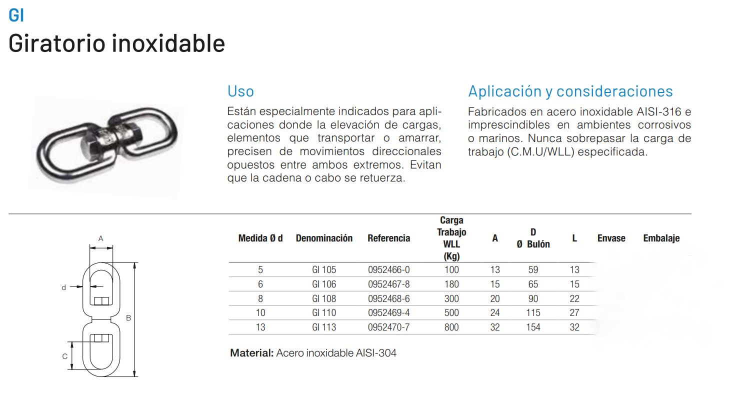 Fabricados en acero inoxidable AISI-316 e imprescindibles en ambientes corrosivos o marinos. Nunca sobrepasar la carga de trabajo (C.M.U/WLL) especificada.