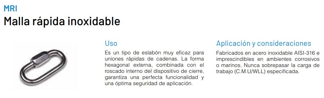 La malla rápida, es un eslabón muy eficaz a la hora de conseguir uniones rápidas, especialmente de cadenas. La forma hexagonal externa combinada con la rosca interior de cierre, garantizan un perfecto funcionamiento y una óptima seguridad de la aplicación.
