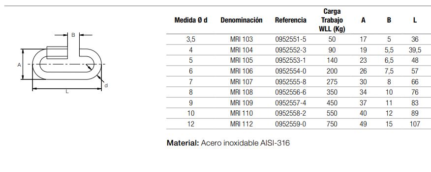 Aplicación y consideraciones Fabricados en acero inoxidable AISI-316 e imprescindibles en ambientes corrosivos o marinos. Nunca sobrepasar la carga de trabajo (C.M.U/WLL) especificada.