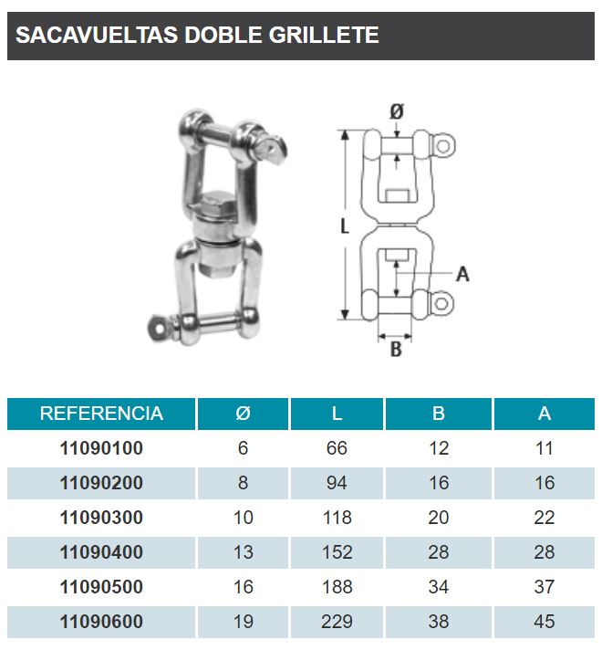 Sacavueltas doble grillete inoxidable 316 AISI. Disponible en varias medidas.
