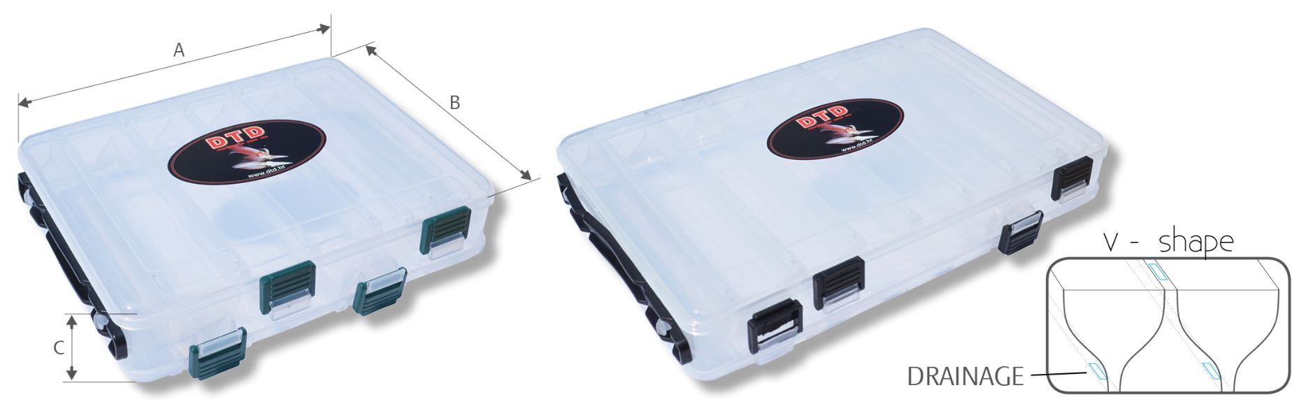 Caja DTD para tener nuestros señuelos bien organizados. Se abre por las dos caras y están separadas aprovechando así la capacidad de la caja. Dos tamaños L con 10 huecos y XL con 14 huecos.