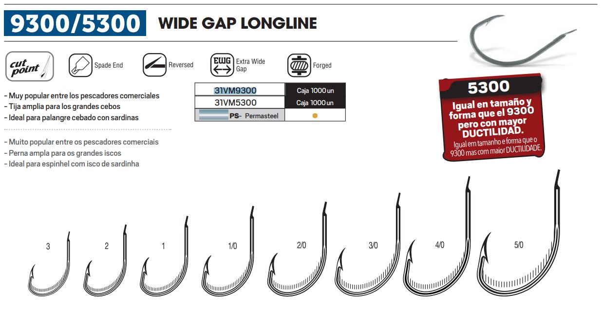 En el desarrollo de anzuelos para la pesca Profesional, VMC ha realizado un esfuerzo extra, creando un anzuelo con una resistencia a la oxidación superior a las 1000 horas y una potencia única para la pesca de Merluza y Lubina. Ref 31VM5300 y 31VM9300 cajas de 1000 unidades