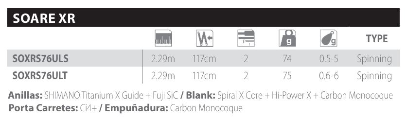 La Soare XR ha sido desarrollada específicamente para la pesca de rock fishing tanto desde la orilla como desde la embarcación. Construido con la última tecnología y componentes de carbono, ofrece un rendimiento muy elevado para el pescador serio de LRF. Disponible en opciones de puntera híbrida y tubular, la Soare XR se sitúa en la parte superior de la gama Shimano LRF.