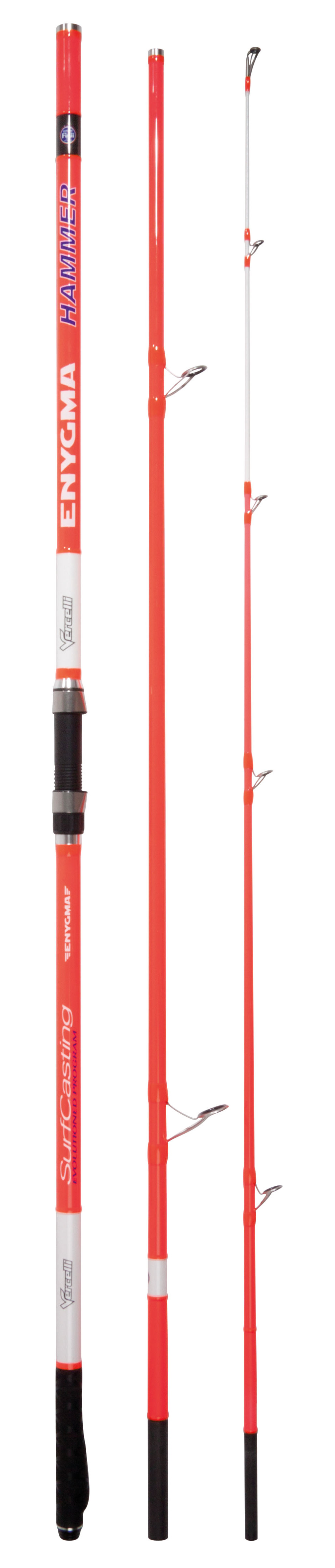 Caña de surfcasting VERCELLI ENYGMA HAMMER de 4,20 metros con 3 tramos y una acción de 150g - 250 gramos. Montada con anillas FUJI KW ALCONITE.