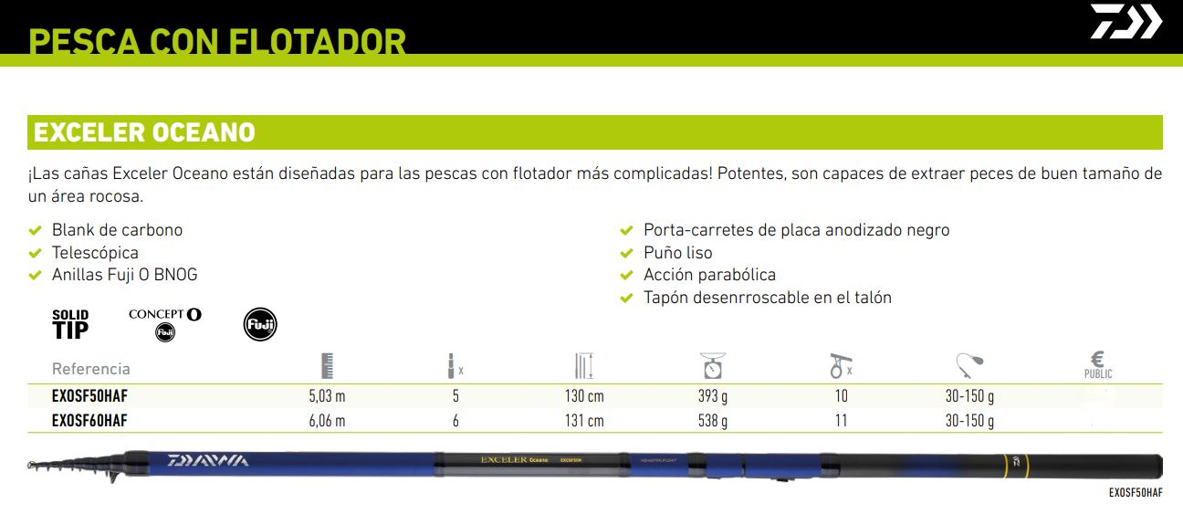 Las cañas DAIWA Exceler Oceano están diseñadas para las pescas con flotador más complicadas. Disponible en dos tallas 5,03 metros y 6,06 metros.