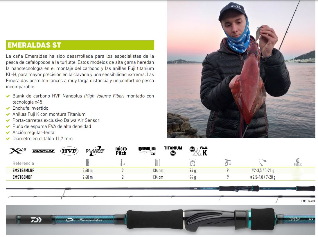 La caña DAIWA Emeraldas ha sido desarrollada para los especialistas de la pesca de cefalópodos a la turlutte. Medida2,60 metros en dos tramos. Modelo Referencia EMST86MLBF Acción señuelos #2-3,5 / acción gramos 5-21g y el modelo referencia EMST86MBF #2,5-4,0 / 7-28 gramos.