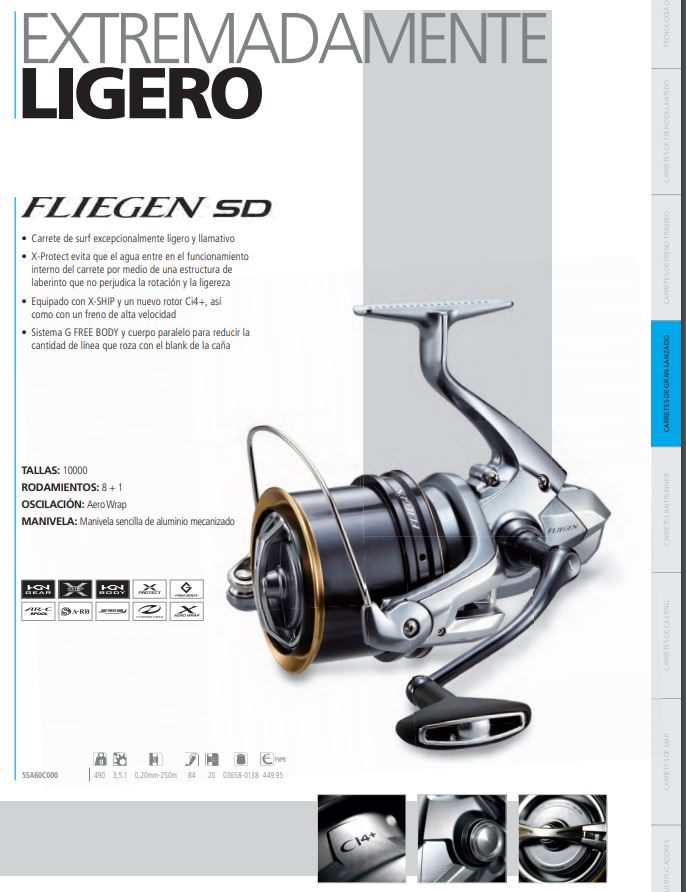 Este atractivo carrete de surf está diseñado para ser liviano y fuerte. Equipado con el nuevo sistema X-Protect, todas las partes internas del carrete están protegidas por medio de una estructura laberíntica y una protección sin contacto que no afecta la ligereza de la rotación. Además de eso, el Fliegen está equipado con un nuevo diseño de rotor de CI4 +, el conocido sistema X-SHIP y el nuevo freno Hi-Speed Drag. El cuerpo del carrete es HAGANE con el fin de garantizar la resistencia y proteger las partes internas del carrete, así como el fuerte engranaje de HAGANE y el refinado sistema X-SHIP. El nuevo diseño del rotor CI4 + del Fliegen SD y el G-Free Body contribuyen mucho a la sensación de ligereza y suavidad del carrete. El diseño del cuerpo Parrallel elimina la posibilidad de que la línea roce con la caña al lanzar, dando como resultado lanzados más largos y precisos.