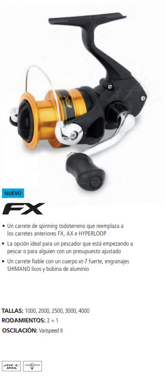 El FX es un carrete giratorio completo que sustituye a los carretes FX, AX e HYPERLOOP anteriores. Es una opción ideal para el pescador que recién está comenzando a pescar o tiene un presupuesto pequeño, pero aún quiere pescar con un carrete confiable. En este segmento, hay muchos carretes giratorios de mala calidad en el mercado con 'altas especificaciones' (publicidad con 10 rodamientos de bolas, etc.). El FX no tiene 10 rodamientos de bolas, pero tiene la calidad por la que Shimano es conocido; Engranaje Shimano fuerte y suave, carrete de aluminio y un cuerpo fuerte XT-7.