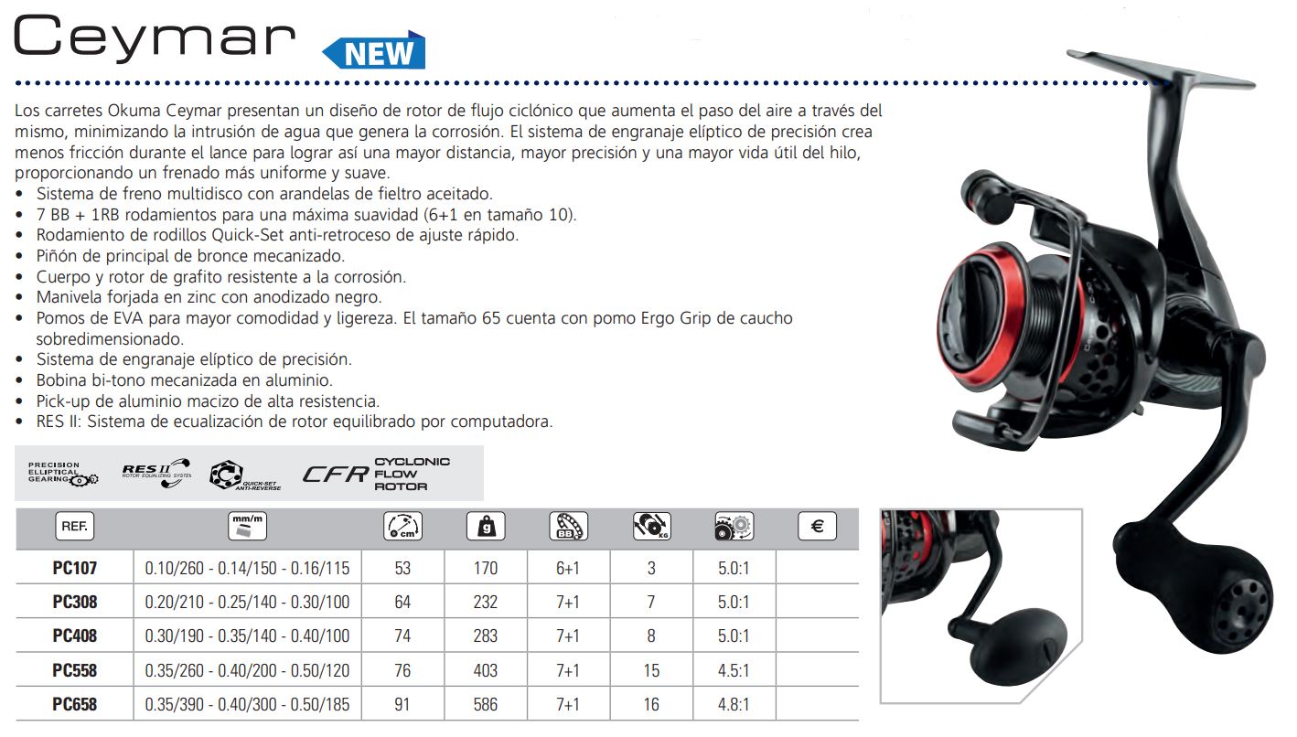 Los carretes Okuma Ceymar presentan un diseño de rotor de flujo ciclónico que aumenta el paso del aire a través del mismo, minimizando la intrusión de agua que genera la corrosión. El sistema de engranaje elíptico de precisión crea menos fricción durante el lance para lograr así una mayor distancia, mayor precisión y una mayor vida útil del hilo, proporcionando un frenado más uniforme y suave.