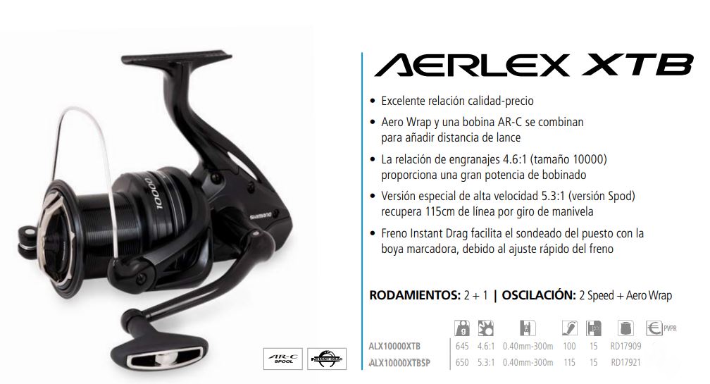La nueva serie Aerlex es un carrete resistente equipado con Instant Drag diseñado para trabajos pesados, ya sea para la pesca de carpas o para el surf. El nuevo diseño y aspecto, la excelente gestión de línea Aero Wrap II con oscilación de 2 velocidades, combinado con la bobina AR-C produce el excelente rendimiento de lanzado requerido por los pescadores de carpa y surf. Una relación de recuperación 4,6: 1 de par de potencia elevado le da al Aerlex la potencia para lidiar con plomadas pesadas sobre terreno irregular. La versión SPOD está equipada con una relación de transmisión más alta de 5,3: 1, que equivale a una recuperación de línea de 115 cm, para asegurarse de que el spod se puede recuperar rápidamente, por lo que puede dedicar más tiempo a la pesca.