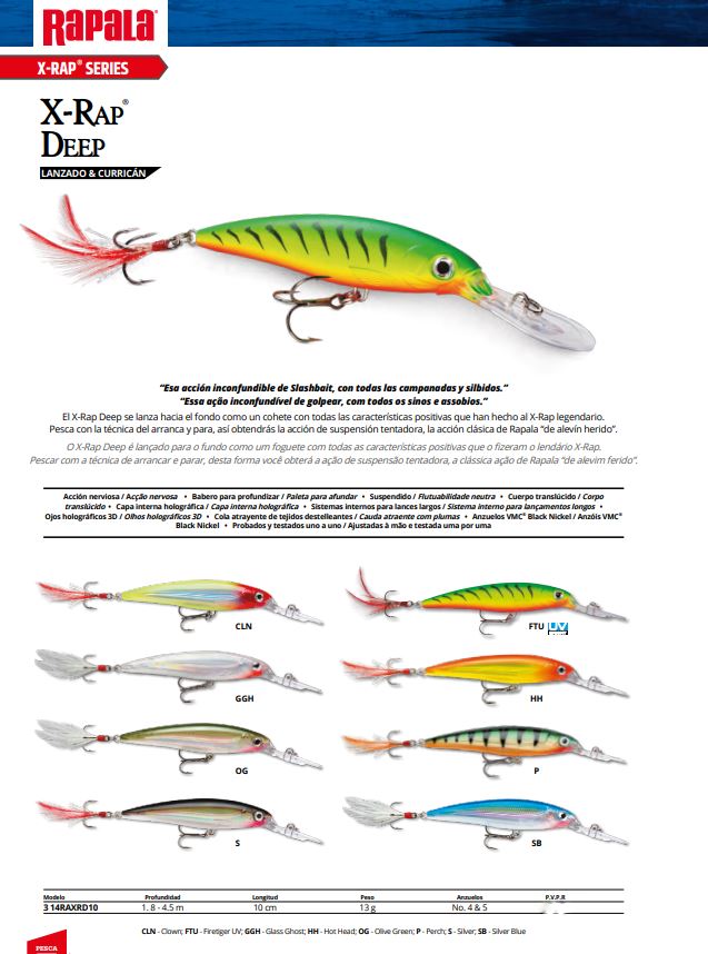 El X-Rap Deep se lanza hacia el fondo como un cohete con todas las características positivas que han hecho al X-Rap legendario. Pesca con la técnica del arranca y para, así obtendrás la acción de suspensión tentadora, la acción clásica de Rapala “de alevín herido”.