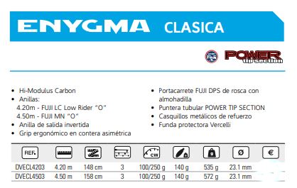 Vercelli ENYGMA CLASICA Rute 4,20 Meter 3 Abschnitte und Wirkung von 100/250 Gramm. FUJI LC Low Rider "O" Führungen.