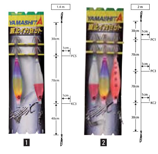 Yamashita-Rigs für das Tintenfischfischen im klassischen Drop Shot-Stil. Weichkörpersilikonköder. Erhältlich in 4 Modellen mit 2 und 3 kleinen Vögeln.