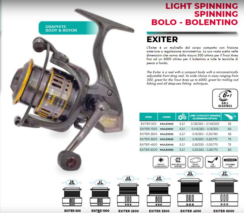 Wird für LIGHT SPINNING, SPINNING, BOLO und Bolantin verwendet. Exiter ist eine kompakte Körperrolle mit vorderer Reibung mit mikrometrischer Einstellung. Erhältlich in 6 Größen: 500, 1000, 2500, 3500, 4500 und 6000.