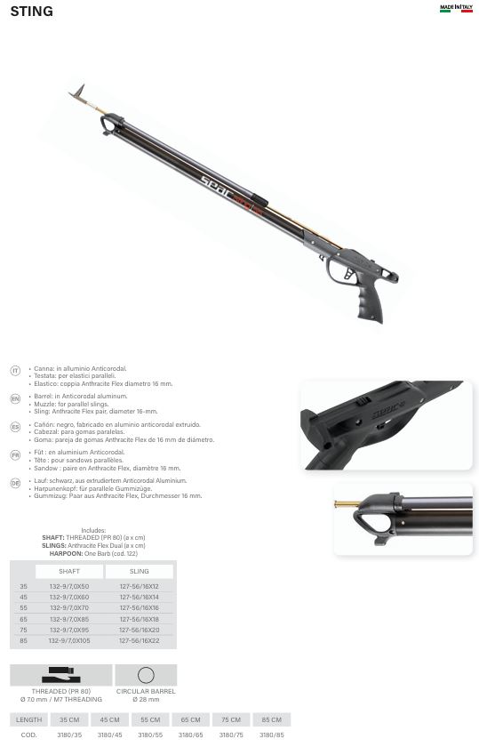 Fusil de varias medidas. Cañon de 28 mm con cabezal doble para elásticos paralelos. Culata con empuñadura anatómica y apoyo de carga en pecho. Elástico en látex color ámbar d 16 mm. Flecha con varilla PR80 en acero.