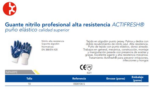Tejido en algodón punto jersey. Palma y dedos con doble recubrimiento de nitrilo azul. Alta resistencia. Puño de tejido con punto elástico, dorso aireado. Trabajos en general, mecánica, construcción, montaje y manipulación pesada con presencia de aceites y grasas. Excelente agarre y alta resistencia mecánica. Tratamiento Actifresh® para prevenir irritaciones, infecciones y hongos