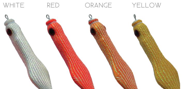 Señuelo plomado de tela soft flash con un peso de 120 gramos. El modelo 40210 120 gramos es de 2 coronas. Disponible en 4 colores flash con ojos rojos.