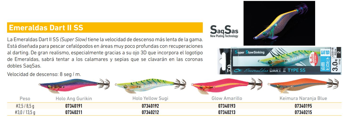 La Emeraldas Dart II SS (Super Slow) tiene la velocidad de descenso más lenta de la gama. Está diseñada para pescar cefalópodos en áreas muy poco profundas con recuperaciones al darting. De gran realismo, especialmente gracias a su ojo 3D que incorpora el logotipo de Emeraldas, sabrá tentar a los calamares y sepias que se clavarán en las coronas dobles SaqSas.