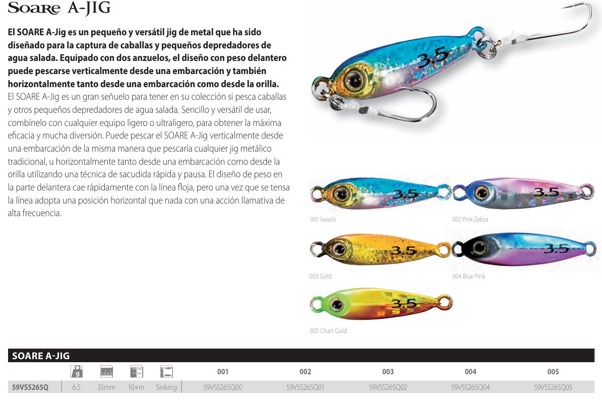 El Soare A-Jig es un gran señuelo para tener en su colección si pesca caballas y otros pequeños depredadores de agua salada. Sencillo y versátil de usar, combínelo con cualquier equipo ligero o ultraligero, para obtener la máxima eficacia y mucha diversión. Puede pescar el Soare A-Jig verticalmente desde una embarcación de la misma manera que pescaría cualquier jig metálico tradicional, u horizontalmente tanto desde una embarcación como desde la orilla utilizando una técnica de sacudida rápida y pausa. El diseño de peso en la parte delantera cae rápidamente con la línea floja, pero una vez que se tensa la línea adopta una posición horizontal que nada con una acción llamativa de alta frecuencia.