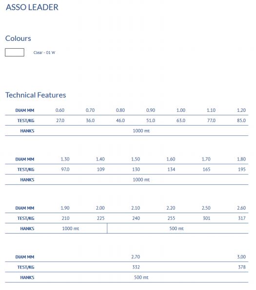 Madejas de monofilamento ASSO LEADER desde 110mm hasta 250mm en madejas de 1000 metros de longitud. Monofilamento reforzado de alta calidad recomendado para la pesca del atún, pez espada y grandes peces.