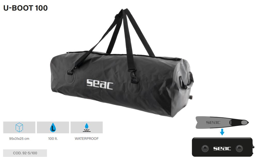 Seac U-Boot 100 es la bolsa impermeable de 100 litros para buceo y apnea, perfecta para transportar aletas largas y equipos húmedos. Esta bolsa impermeable grande (95x31x25 cm) está hecha de Tarpaulin (lona) y puede enjuagarse con agua dulce después de su uso. La tapa lateral facilita el escape del exceso de agua y el secado. Los cordones se han reforzado en el accesorio para transportar equipo pesado. Secado rápido. Correas de hombro reforzadas.