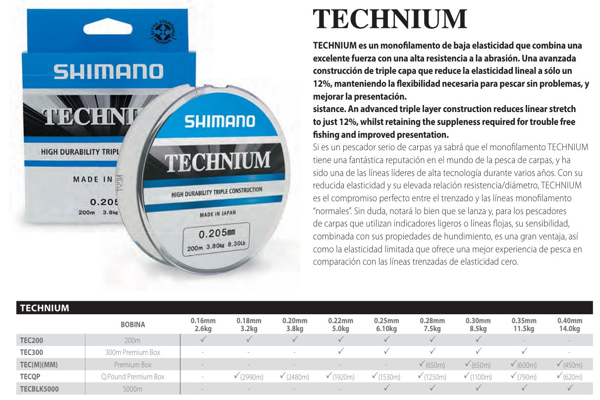 Monofilamento SHIMANO TECHNIUM de baja elasticidad que combina una excelente fuerza con una alta resistencia a la abrasión. Medidas disponibles 0.185mm X 3000m, 0.205mm X 2480m y 0.225mm X 1920 metros.