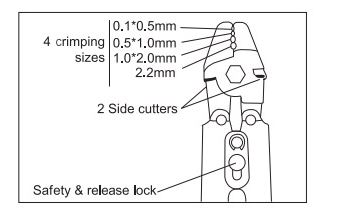 - Mordazas de acero endurecido con cuatro posiciones de prensado desde 0.5mm hasta 2.2mm