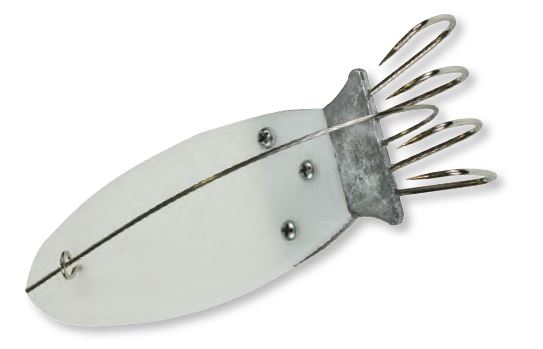 Pulpera Tipo barquilla con cuatro anzuelos y sujetador de cebo. Color nacarado.