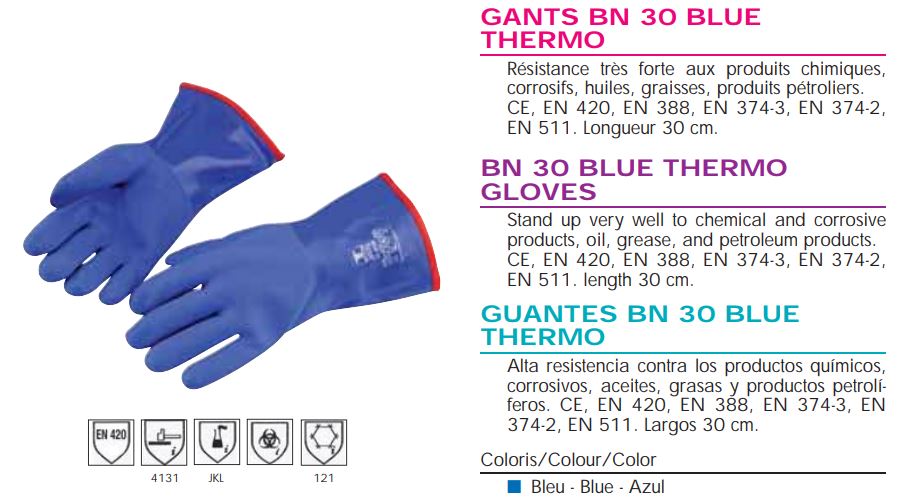 GUANTES BN 30 BLUE THERMO Alta resistencia contra los productos químicos, corrosivos, aceites, grasas y productos petrolíferos. CE, EN 420, EN 388, EN 374-3, EN 374-2, EN 511. Largos 30 cm, Color Azul