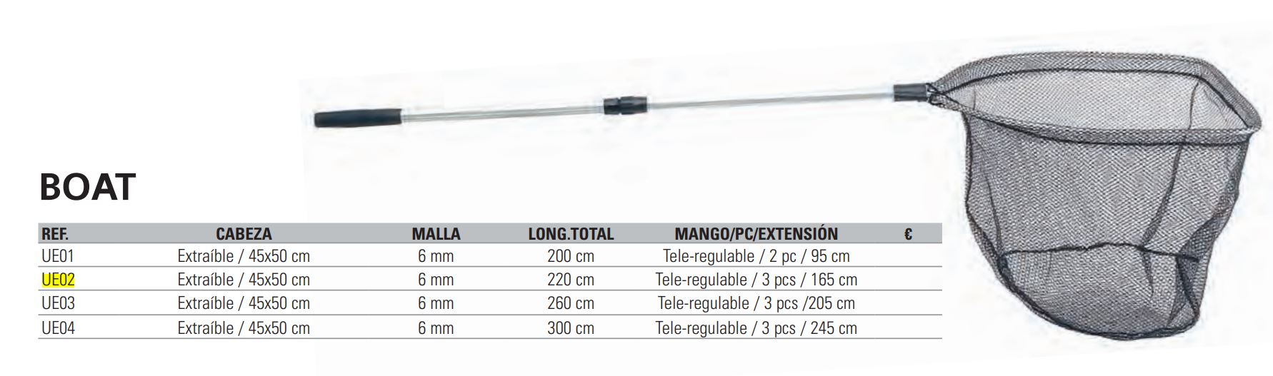 Salabre EVIA BOAT 4 medidas, Modelo UE01 2 METROS, Modelo UE02 2,20 metros, Modelo UE03 2,60 metros y modelo UE04 3 metros. Malla de nylon de 6mm y cabeza extraible. Mango extensible.