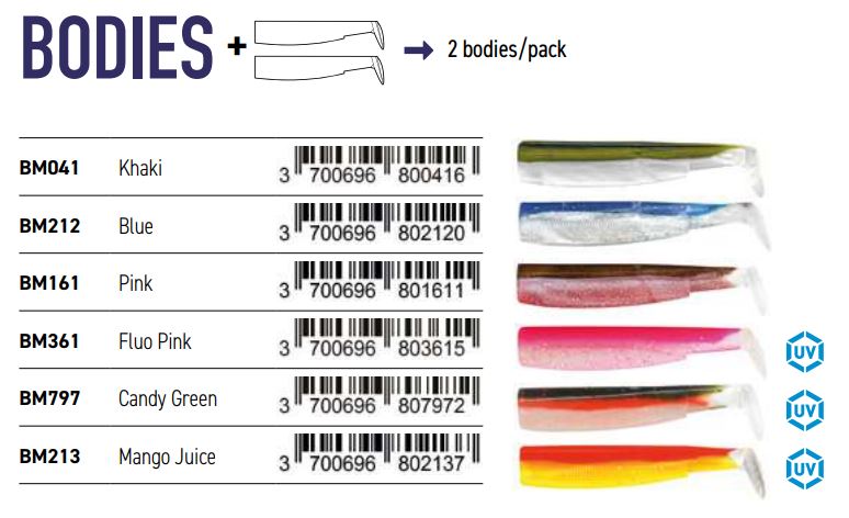 Cuerpos Black Minnow Nº6 de 200mm (8 pulgadas). Disponible en varios colores. Utilizado para cambiar los cuerpos del black minnow nº6 Cada envase incluye dos cuerpos.