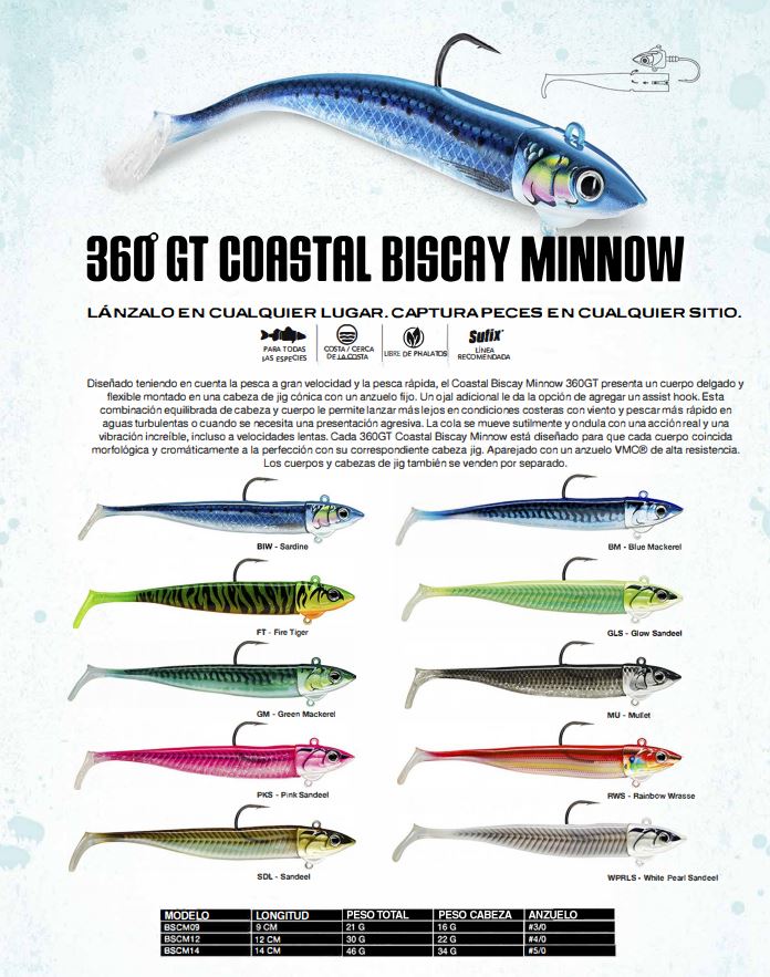 Diseñado teniendo en cuenta la pesca a gran velocidad y la pesca rápida, el Coastal Biscay Minnow 360GT presenta un cuerpo delgado y flexible montado en una cabeza de jig cónica con un anzuelo fijo. Un ojal adicional le da la opción de agregar un assist hook. Esta combinación equilibrada de cabeza y cuerpo le permite lanzar más lejos en condiciones costeras con viento y pescar más rápido en aguas turbulentas o cuando se necesita una presentación agresiva. La cola se mueve sutilmente y ondula con una acción real y una vibración increíble, incluso a velocidades lentas. Cada 360GT Coastal Biscay Minnow está diseñado para que cada cuerpo coincida morfológica y cromáticamente a la perfección con su correspondiente cabeza jig. Aparejado con un anzuelo VMC® de alta resistencia.