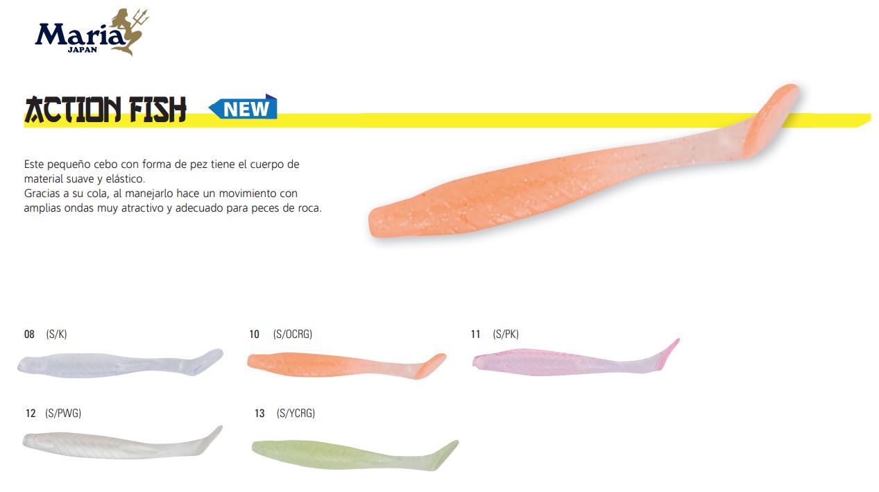 Este pequeño cebo con forma de pez tiene el cuerpo de material suave y elástico. Gracias a su cola, al manejarlo hace un movimiento con amplias ondas muy atractivo y adecuado para peces de roca.